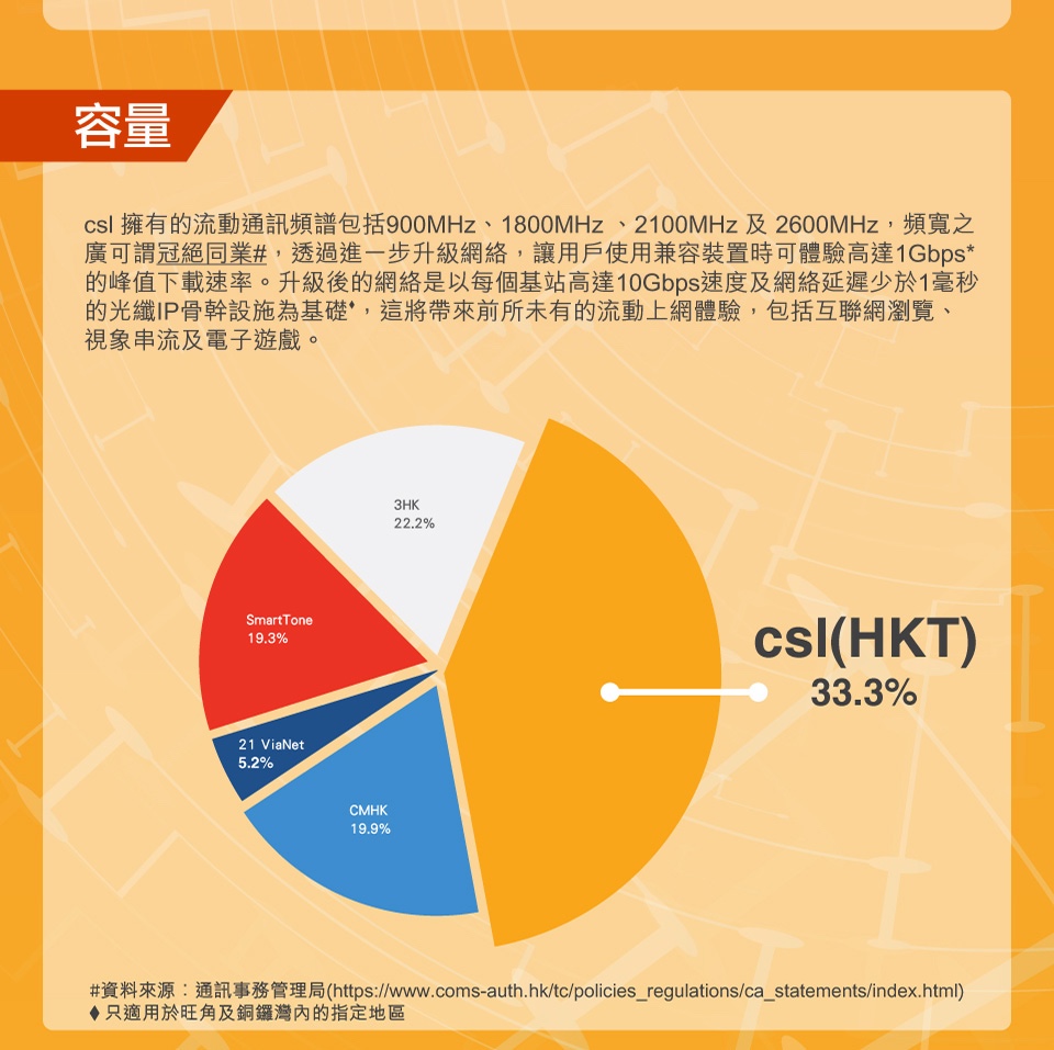 csl 是全港首家將 5G 網絡帶入地下,現已全面覆蓋港鐵所有綫路,包括所有港鐵站的車站大堂、月台、車廂、及行車管道,其中包括屯馬線,及東鐵綫過海段@ (紅磡站經會展站至金鐘站)。同時,我們是首家提供5G網絡覆蓋所有港鐵綫,並以專屬頻譜覆蓋東鐵綫過海段的網絡營運商,讓5G用戶能體驗真正高速5G流動網絡。由於 csl 5G 網絡採用專屬頻譜並不是共享頻譜技術,所以,csl 5G 用戶並不需要與 4G 用戶分享頻譜使用,5G 用戶不單可以感受到真正 5G 高速體驗,而 4G 用戶的網絡體驗亦不會受到影響。